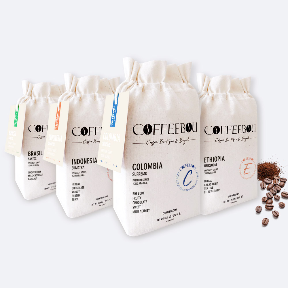 Sizi, özenle hasat edilmiş birbirinden kaliteli kahve çekirdeklerinin bir araya geldiği Coffeebou’da bir lezzet yolculuğuna davet ediyoruz. Sipariş verdiğiniz kahvenizi isteğinize göre ister çekirdek isterseniz de demleme ekipmanınıza uygun filtre aralığında öğütüyor taze taze adresinize gönderilmek üzere önce kahveye uygun valfli kraft paketlerine koyuyor ardından naturel %100 doğal pamuktan üretilen şık ambalajlarında paketliyoruz.
